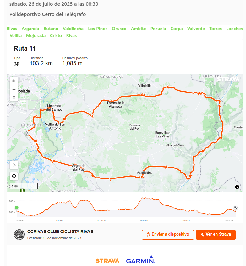 Ruta 11: 103km, 1.085m+, IBP: 73 + Añadir Google Calendar Exportación + iCal / Outlook Fecha Jul 26 2025 Finalizdo! Hora 08:30 - 18:00 Localización Polideportivo Cerro del Telégrafo Calle de la Fundición, 2 Organizador Club Ciclista Rivas Correo electrónico directiva@ccrivas.org Compartir este evento