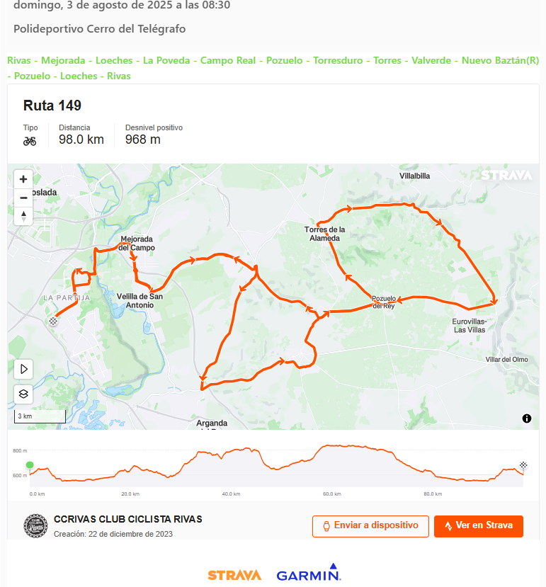 Ruta 149: 97km, 968m+, IBP: 61 + Añadir Google Calendar Exportación + iCal / Outlook Fecha Ago 03 2025 Finalizdo! Hora 08:30 - 18:00 Localización Polideportivo Cerro del Telégrafo Calle de la Fundición, 2 Organizador Club Ciclista Rivas Correo electrónico directiva@ccrivas.org Compartir este evento