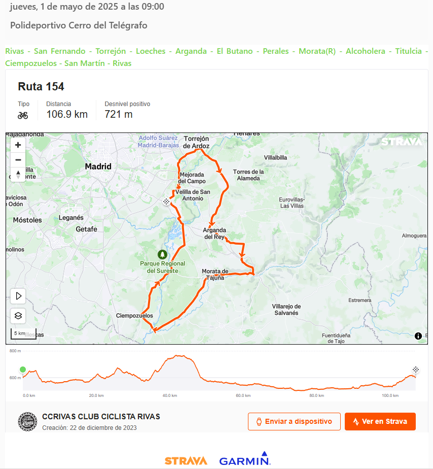 Ruta 154: 107km, 754m+, IBP: 60 + Añadir Google Calendar Exportación + iCal / Outlook Fecha May 01 2025 Finalizdo! Hora 09:00 - 18:00 Localización Polideportivo Cerro del Telégrafo Calle de la Fundición, 2 Organizador Club Ciclista Rivas Correo electrónico directiva@ccrivas.org Compartir este evento