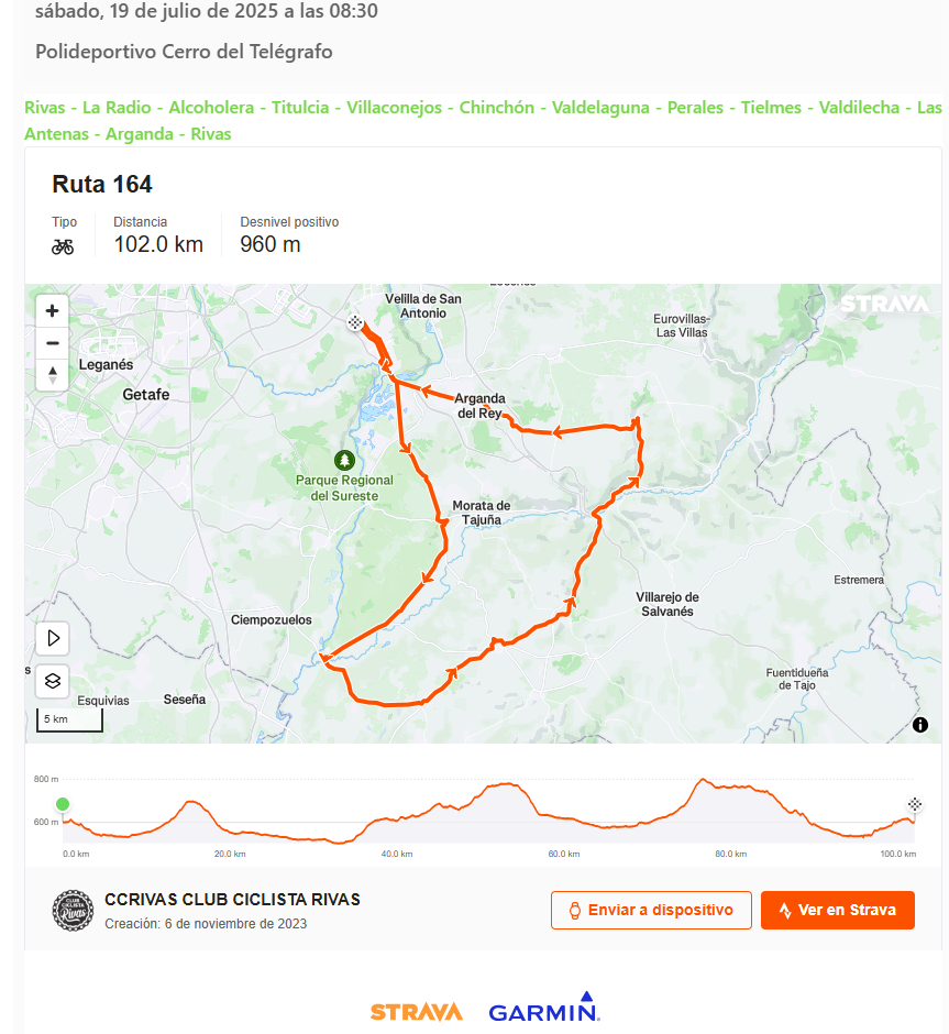Ruta 164: 102km, 948m+, IBP: 68 + Añadir Google Calendar Exportación + iCal / Outlook Fecha Ago 23 2025 Finalizdo! Hora 08:30 - 18:00 Localización Polideportivo Cerro del Telégrafo Calle de la Fundición, 2 Organizador Club Ciclista Rivas Correo electrónico directiva@ccrivas.org Compartir este evento