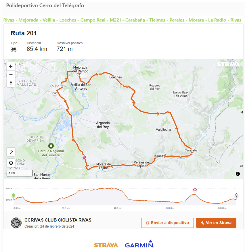 Ruta 201: 85,5km, 730m+, IBP: 45 + Añadir Google Calendar Exportación + iCal / Outlook Fecha Ene 04 2026 Finalizdo! Hora 10:00 - 18:00 Localización Polideportivo Cerro del Telégrafo Calle de la Fundición, 2 Organizador Club Ciclista Rivas Correo electrónico directiva@ccrivas.org Compartir este evento