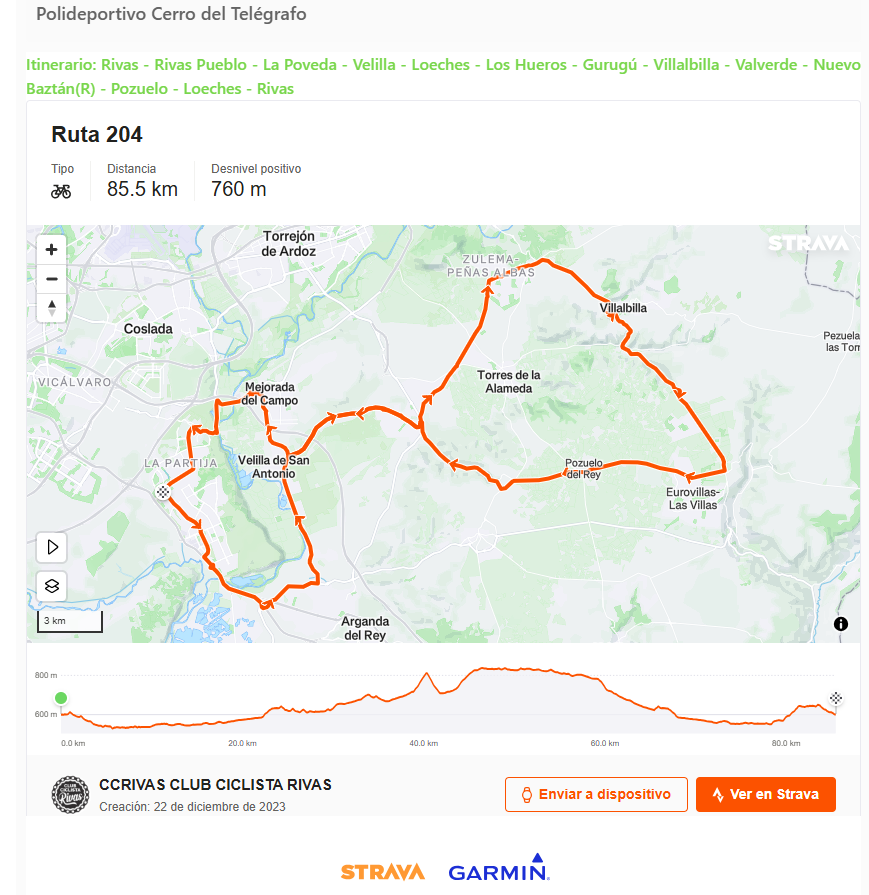 Ruta 204: 85km, 760m+, IBP: 47 + Añadir Google Calendar Exportación + iCal / Outlook Fecha Nov 16 2025 Finalizdo! Hora 09:30 - 18:00 Localización Polideportivo Cerro del Telégrafo Calle de la Fundición, 2 Organizador Club Ciclista Rivas Correo electrónico directiva@ccrivas.org Compartir este evento