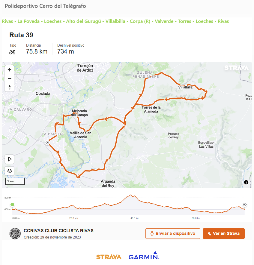 Ruta 39: 76km, 747m+, IBP: 40 + Añadir Google Calendar Exportación + iCal / Outlook Fecha Dic 08 2025 Hora 10:00 - 18:00 Localización Polideportivo Cerro del Telégrafo Calle de la Fundición, 2 Organizador Club Ciclista Rivas Correo electrónico directiva@ccrivas.org Compartir este evento