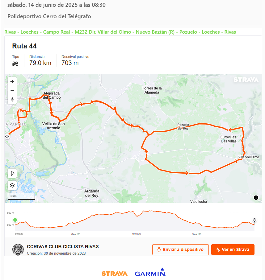 Ruta 44: 79km, 709m+, IBP: 40 + Añadir Google Calendar Exportación + iCal / Outlook Fecha Nov 22 2025 Hora 09:30 - 18:00 Localización Polideportivo Cerro del Telégrafo Calle de la Fundición, 2 Organizador Club Ciclista Rivas Correo electrónico directiva@ccrivas.org Compartir este evento
