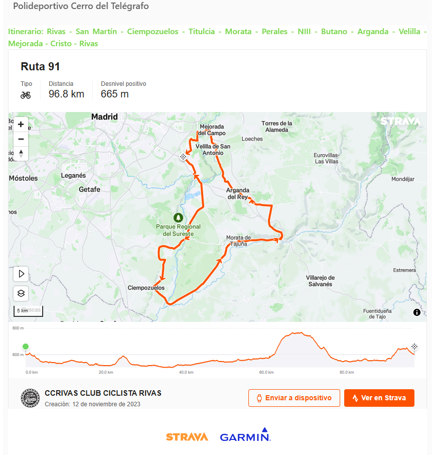 Ruta 91: 97,1km, 684m+, IBP: 51 + Añadir Google Calendar Exportación + iCal / Outlook Fecha Nov 15 2025 Finalizdo! Hora 09:30 - 18:00 Localización Polideportivo Cerro del Telégrafo Calle de la Fundición, 2 Organizador Club Ciclista Rivas Correo electrónico directiva@ccrivas.org Compartir este evento